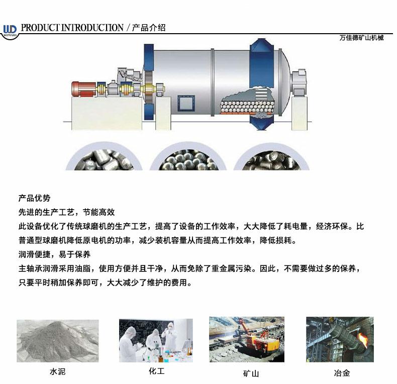 【應用范圍】:球磨機是物料被破碎之后,再進行粉碎的關鍵設備。球磨機廣泛應用于水泥,硅酸鹽制品,新型建筑材料、耐火材料、化肥、黑色與有色金屬選礦以及玻璃陶瓷等生產(chǎn)行業(yè),對各種礦石和其它可磨性物料進行干式或濕式粉磨。